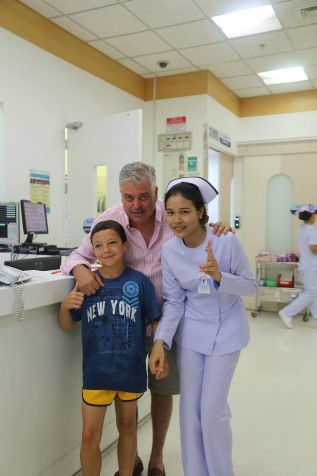 Llevo años en Tailandia y puedo asegurar que es el pais que mejor servicio medico privado tiene en el mundo, lo conozco, de primera mano, al haberlo tenido que utilizar yo en Bangkok, utilizando el hospital BUMRUNGRAD y mi hijo Nacho en Phuket en una operación abdominal, en el BANGKOK HOSPITAL. Pero Álvaro, un encantador chaval de 12 años, de vacaciones en Tailandia con sus 8 primos y con sus 5 tías, una gran familia viajando con nosotros en Tailandia, aquella mañana le toco conocerlos. Su juventud, su fuerza, su ilusión y su vitalidad le hicieron dar un salto en la piscina mas allá de lo normal y de lo mortal ……… las consecuencias fueron una brecha de mas de 10 cm en la cabeza. Los teníamos alojados en el norte de la Isla de Phuket, en la preciosa zona de Mai khao, en el hotel Reinassance. De inmediato la familia nos llamo al servicio 24 horas de NTC y mi personal me llamo, al encontrarme yo en la Isla. Aprovechando de mi estancia en Phuket, decidí el Hospital y los mande al mismo que operaron a mi hijo, donde acudí de inmediato, para apoyar a la familia y sobre todo a Álvaro y a su Madre. Nuestra logística, en coordinación con el seguro envió de inmediato una ambulancia al Hotel. Gracias a Dios la brecha era limpia y después de scaners, pruebas y puntos en la cabeza, el campeón salió de urgencias con la sonrisa del miedo olvidada. Su Madre se quedo sorprendida de la atención, trato, servicios, tecnología, personal y medios que tiene este hospital, pero sobre todo de su funcionamiento ….. Una vez salido Álvaro de urgencias, le prepararon, la factura, menos de 120 euros, que se hizo cargo nuestro seguro, le dieron todas las pastillas en el dispensario, con sus dosis en bolsitas separadas, pero sobre todo le dieron un servicio y una sonrisa, tan necesario en estos casos.