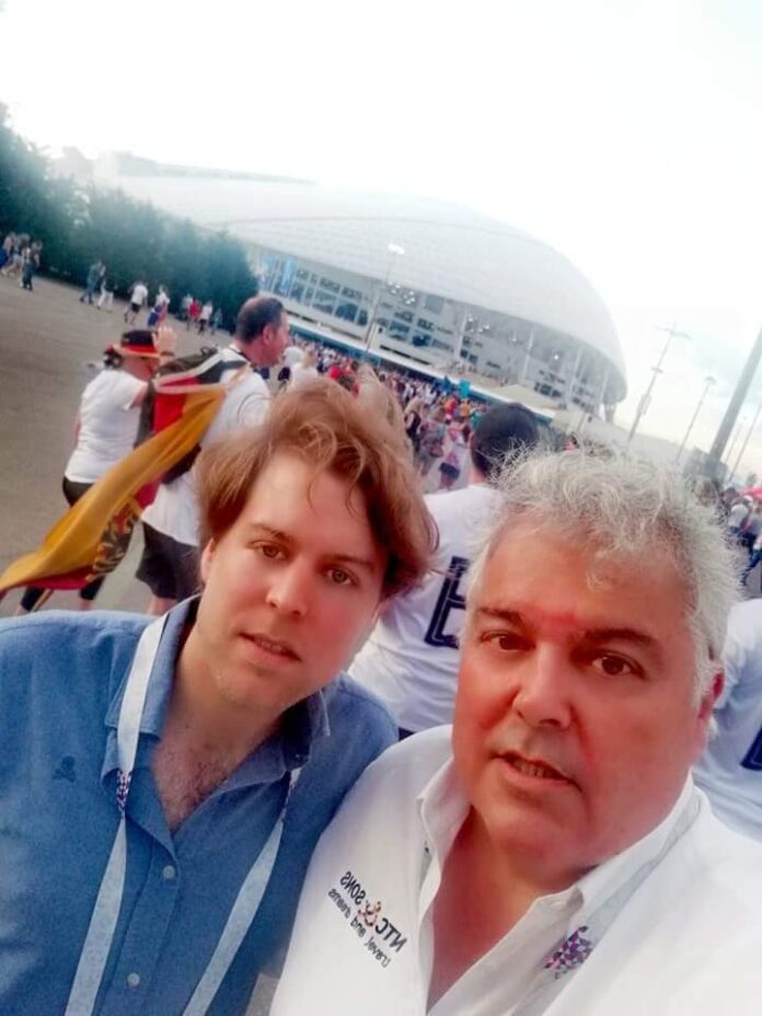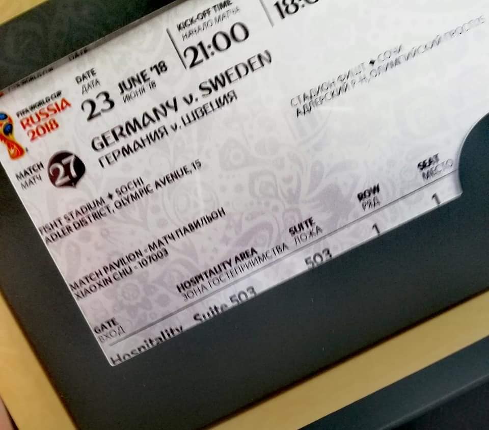 23 de Junio del 2018, DISFRUTANDO con mi hijo de nuestro trabajo, organizando eventos deportivos globales en NTC COMPANY www.ntc1958.com….., el día que libraban las selecciones de nuestros clientes llegados de Suramérica en el Mundial de Futbol, en Rusia 2018. Tocaba un partidazo Suecia & Alemania, con un gran ambientazo en el mejor estadio del Mundial, en la mejor ciudad, SOCHI y disfrutándolo con mi hijo, Nacho y cientos de amigos y clientes llegados de Colombia, Perú, México y España. Nos tocaba disfrutar del mundial…. y que mejor que con las entradas que nos facilito directamente la organización FIFA, la suite 503.