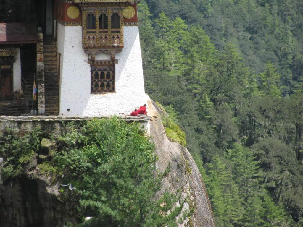 A pie del rio comeremos con la gente de la aldea un rico Jasha Maru, la comida local rica en grasas, tan necesarias para la altura y que hacen a base de carne de pollo, cortada en diminutos tacos y que condimentan con tomate, jengibre, cebolla y ajo. La cantidad, que se come, es tal, que invita a hacer la siesta a la sombra de un árbol para evitar el sol cercano. Meditaremos, aprenderemos de la filosofía budista de la sencillez, cantaremos monótonos canticos hasta llegar a olvidarnos de nuestra vida anterior, pues aquí solo se respira tranquilidad, felicidad y sosiego a los cuatro vientos, los mismos que expanden las plegarias con sus banderolas en las montañas. Por la noche , después de haber cenado la exquisita carne de Yak, nos enseñaran a bailar danza Cham para dormir con la paz que te da el budismo, la altura y el silencio. Ahoya ya solo queda soñar, para la experiencia que me tocara disfrutar de nuevo, al despertarme, volver a subir al monasterio de TAKTSANG, también conocido como TIGER NEST, situado en un altísimo acantilado, colgado de la pared y que en alguna ocasión me ha tocado subir en caballo, al afectarme el cansancio, la respiración y el mal de altura.