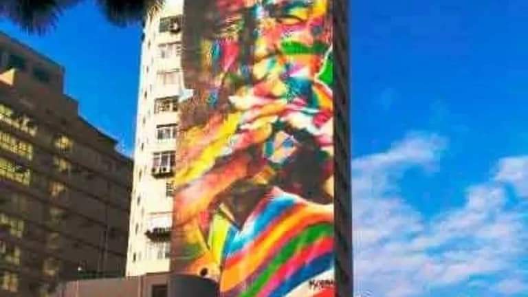 Le hable de Zaragoza, de mi ciudad, de mi proyecto y de la ilusión que tendría en tener su obra en España y ser pioneros en Zaragoza de un gran mural con su firma Kobra y con su historia escrita en su mural. Pues Kobra, que nació en 1975, empezó siendo un Pichacao en su barrio periférico y muy humilde del sur de Sao Paolo, en Jardim Martinica, pintando mensajes crípticos de color negro a los 12 años y poco a poco creció en madurez artística, con la catedra de la calle como mejor experiencia y fue educándose con el color, las formas y la perfección del arte universal de los grafiteros, con una técnica única que domina magistralmente, el caleidoscopio. Él es un auténtico escritor, pues en sus murales logra contar historias con mucha más audiencia que cualquier escritor que se refugia en las paredes de las librerías, pues sus palabras las leen y oyen cada día millones de personas desde sus murales gigantescos, donde con sus aerosoles y pinceles consigue contar historias de marginación, violencia, desesperación, alegría y sueños, convirtiendo sus murales en enciclopedias públicas de cultura en las calles. En mi último viaje a Rio de Janeiro, pude disfrutar del mural gigantesco, que pinto para los Juegos Olímpicos del 2016, sobre las etnias con más de 2500 metros cuadrados, así como el impresionante que en 2017 pinto sobre el CACAO, con más de 5700 metros cuadrados, en una fábrica, sobre la autovía en la provincia de Sao Paolo.