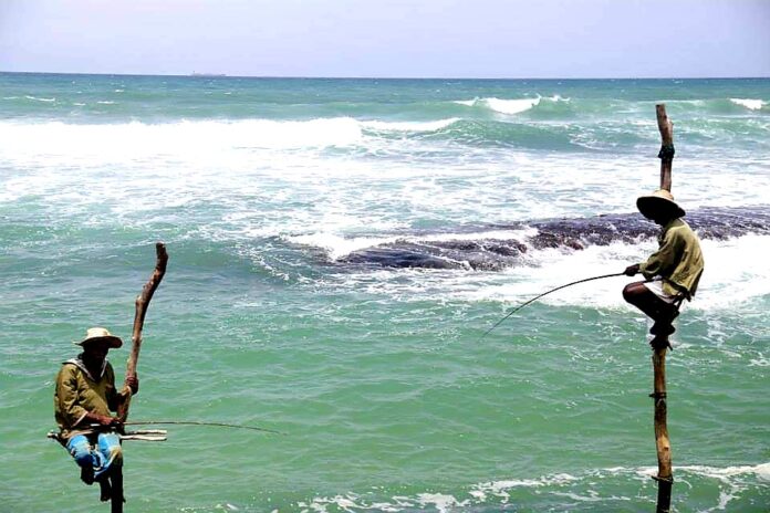 Existen muchos tipos de pesca, como la de altura, de sedal, de lanzado, de flotador……. Pero esta de espera, es muy curiosa y solo se da en la zona de Galle, situada al sur de Sri Lanka www.srilanka.travel. Lamentablente a raiz del Tsunami, del año 2004, practicamente desaprecio, pues la ola asesina esquilmo la costa; pero las familias de pescadores oriundos de esta zona, poco a poco empiezan a recobrar la actividad, aunque muchos de ellos ya ganan mucho mas con las `propinas de los turistas, que con la propia captura. La tecnica, es tan sencilla, como el nombre indica “Pesca a la espera“ …. Se colocan sobre un tronco de madera de unos 4 metros anclados en el mar, entre los corales, que tiene un saliente a modo de asiento, que se llama, Petta y esperan y esperan hasta que los peces se habitúan a su presencia en la orilla. Sus capturas suelen ser pequeños arenques y caballas, como los que hemos visto pescar en el poblado de Kathaluwa. Ha valido la pena la espera también para captar bellas imágenes con la maquina Canon E5 ¡¡¡¡