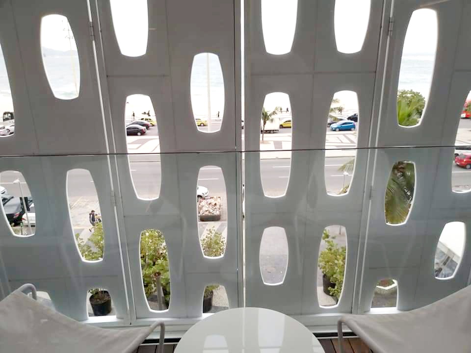 Un hotel minimalista, blanco, en pleno paseo maritimo, inagurado en el 2016, en un solar de poco mas de 1000 mº, que pasa totalmente desapercibido, al tener su fachada unos paneles perforados metalicos que lo hacen singular. Su arquitecto, Arthur Casas, www.ormaarquitectura.cl da prioridad a la luz natural, valoriza la vista y en sus 12 plantas consigue un hotel que quitando la majestuisidad del Copacaban Palace, es mi preferido en la playa de Copacabana y uno de los mas solicitados para disfrutar la Noche de Año Nuevo en sus habitaciones. Aun asi en varios años hemos conseguido, tambien reservar habitaciones para nuestros clientes de NTC COMPANY www.ntc1958.com para disfrutar de una de las mas magicas noches de NOCHE VIEJA en cualquier lugar del mundo, en este caso con la vista a la Playa de Copacabana donde se agolpan centenares de miles de personas. Es de resaltar la amplitud de las habitaciones, su luminosidad y la fina decoracion, asi como la firma del artista paisajista Roberto Burle en todas las estancias del hotel. Son hoteles, que ademas pertnecen a la cadena LHW www.lhw.com Rio de Janeiro, bien se merece una visita y un capricho como este, con su piscina en la ultima planta, mirando a Copacabana y una habitacion con una exclusiva terraza, con vistas a una de las ciudades mas bonitas del Mundo.