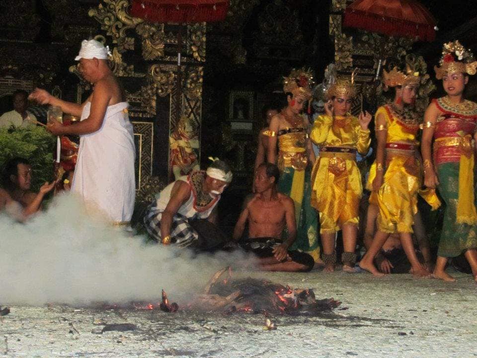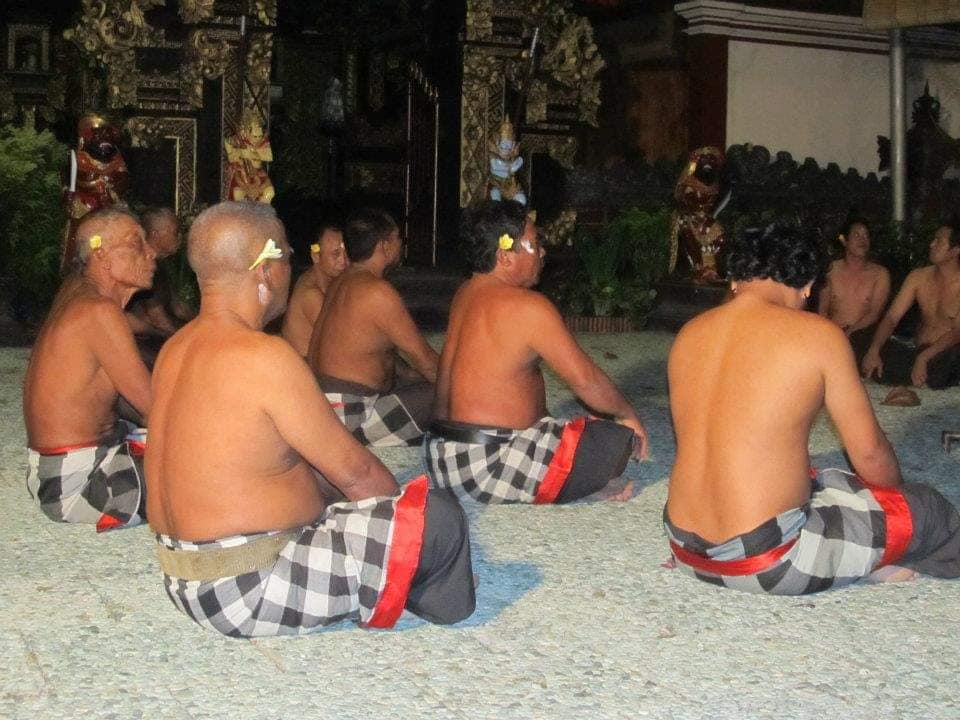 El KECHAK es una DANZA BALINESA que se practica principalmente por hombres en la Isla, en los ritos hindus. www.disfrutabali.com Son grupos de aproximadamente cien hombres que se ponen en forma de círculo, alrededor de una hoguera, sentados en torno a un líder. Están uniformados en la vestimenta, con las ropas tipicas balinesas, de algodones a cuadros alrededor de la cintura, y a veces usan flores rojas en la cabeza. El baile consiste en movimientos de brazos y de torso, bruscos, acompañado por coros vocales. Esta danza es una representación de la batalla en la que el Vanara Januman ayudo al príncipe RAMA a vencer al malvado rey RAVANA. Sus orígenes, vienen de una danza de exorcizacion llamada SANGHYANG.