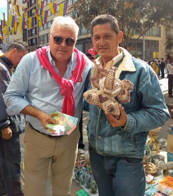 Hoy paseando por el centro de Bogotá, donde hay decenas de miles de venezolanos, me encontré a Luis, un artista que hace auténticas obras de arte con billetes de curso real venezolanos.